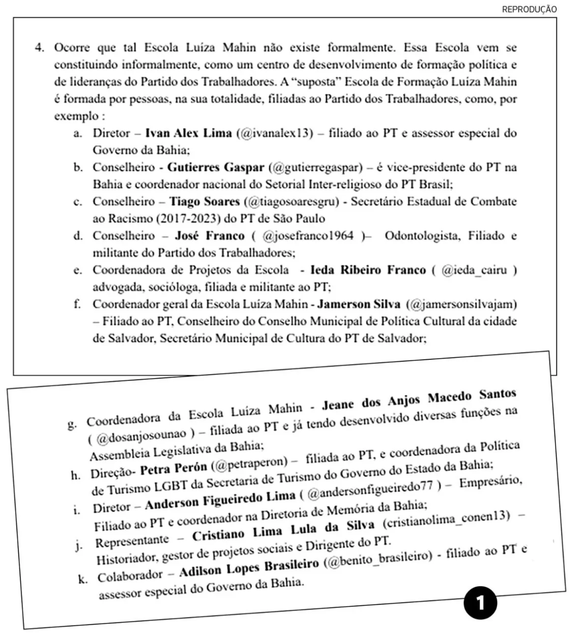 A Congregação da Escola de Administração aprovou o curso “sem minimamente saber do que se tratava de fato essa tal Escola de Formação Política Luíza Mahin”, conforme a acusação. De acordo com a denúncia, os diretores, conselheiros e coordenadores da escola são filiados ao PT. No Instagram, Gutierres Barbosa, que é vice-presidente do PT da Bahia, é descrito como o diretor da Escola de Luíza Mahin.