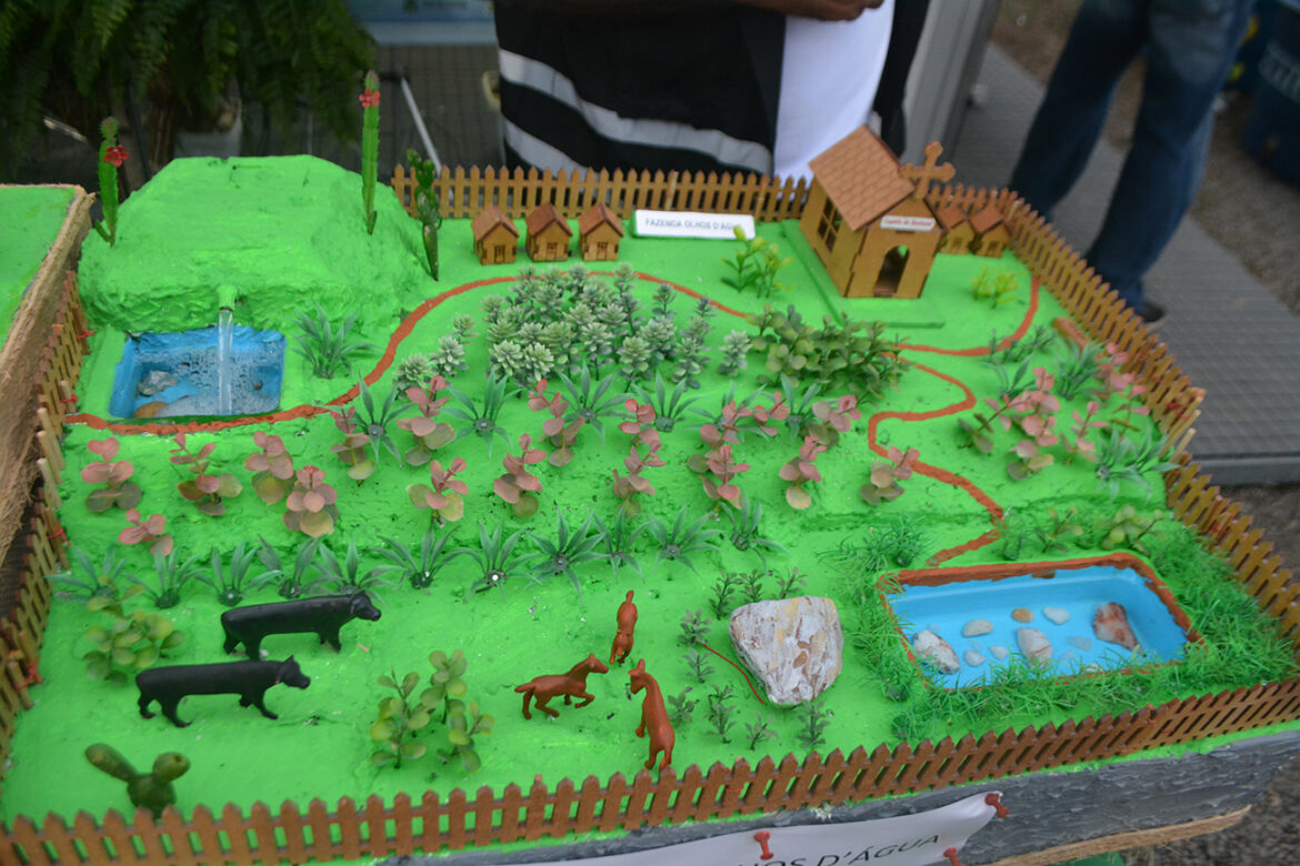 Duas maquetes educativas de paisagem, colocadas à frente do estande da Secretaria de Meio Ambiente no Parque de Exposições João Martins da Silva, retratam aspectos históricos de Feira de Santana e do então distrito de Gameleira — hoje Governador João Durval Carneiro — no século XVIII. Elas contam partes importantes da história local, enquanto os visitantes ouvem explicações detalhadas sobre as representações.