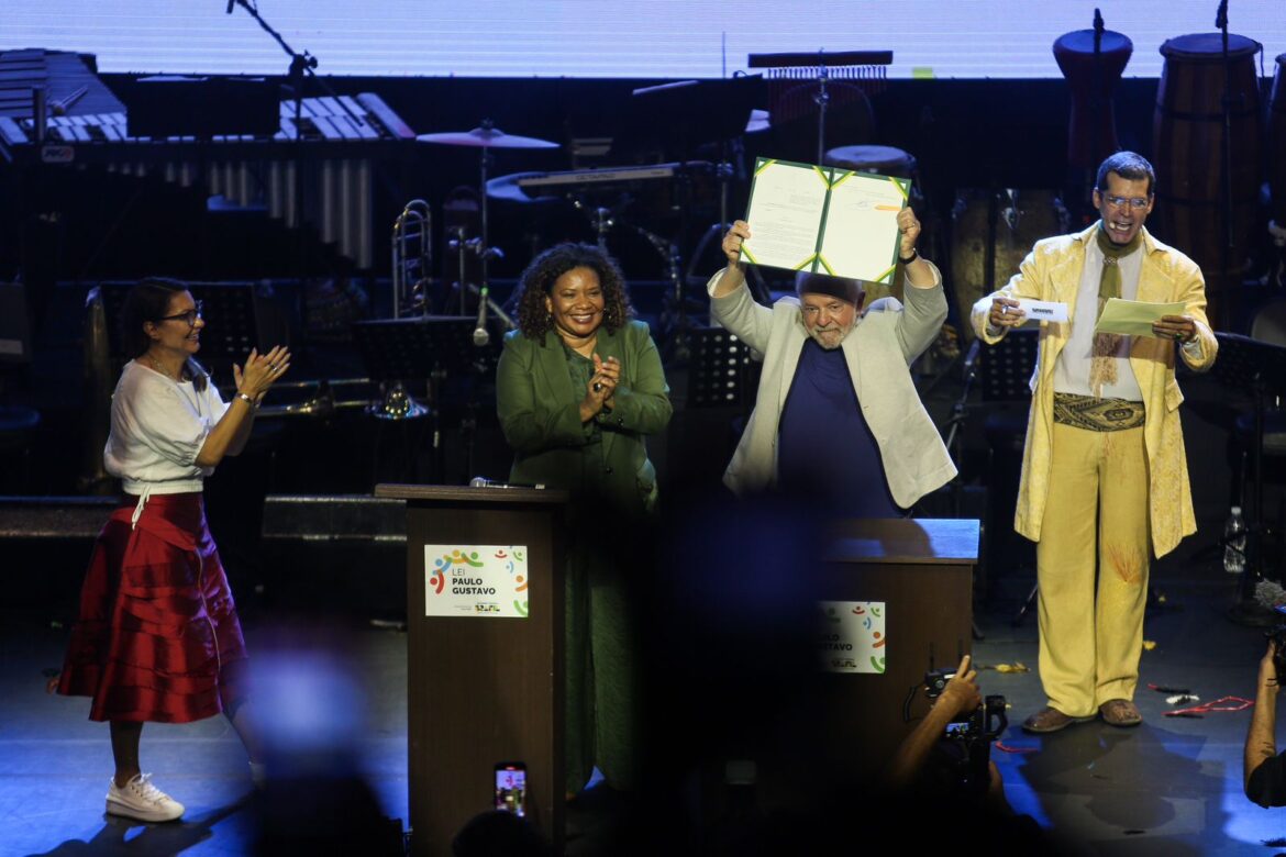 Antes de Lula, a ministra da Cultura, Margareth Menezes, em seu discurso ressaltou a importância e a representação da Lei Paulo Gustavo para atender “o grito de socorro” do setor cultural.
