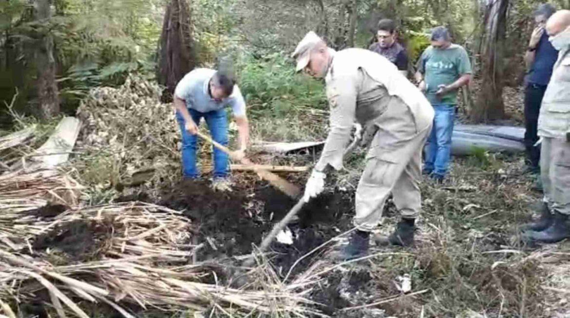 O delegado detalha que, nesta quinta-feira (6/7), policiais civis da unidade localizaram a cova com o corpo de Francisco. “Vimos marcas de machado na cabeça, facadas, uma espingarda enterrada. Os vizinhos escutaram tiros na região, mas não vimos marcar de tiro no corpo dele”, diz. No local, policiais civis encontraram ao menos dez munições de uma espingarda.