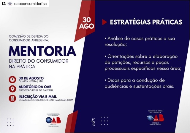 Uma mentoria de direito do consumidor na prática será realizada pela Comissão de Direito do Consumidor da OAB Subseção Feira de Santana no próximo dia 30, às 14h. O evento é gratuito e acontecerá no auditório da instituição localizado na rua Cel. Álvaro Simões, 74, bairro Centro.