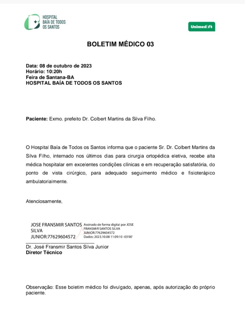 O prefeito Colbert Filho recebeu alta na manhã deste domingo (8) e já está em casa onde seguirá se recuperando de uma cirurgia ortopédica eletiva (no joelho), bem como acompanhando os assuntos da administração pública municipal.