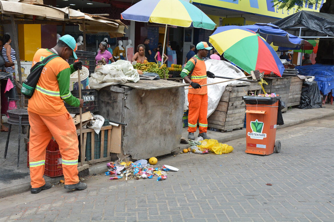 Ao seu lado, Edson Souza puxa o carrinho de coleta de lixo, como também atua na varrição. “Gosto muito do meu trabalho”, diz ele que mora na Mantiba e precisa sair de casa às 5h para começar o trabalho às 6h. “Me sinto feliz e agradecido pela função que desempenho”.