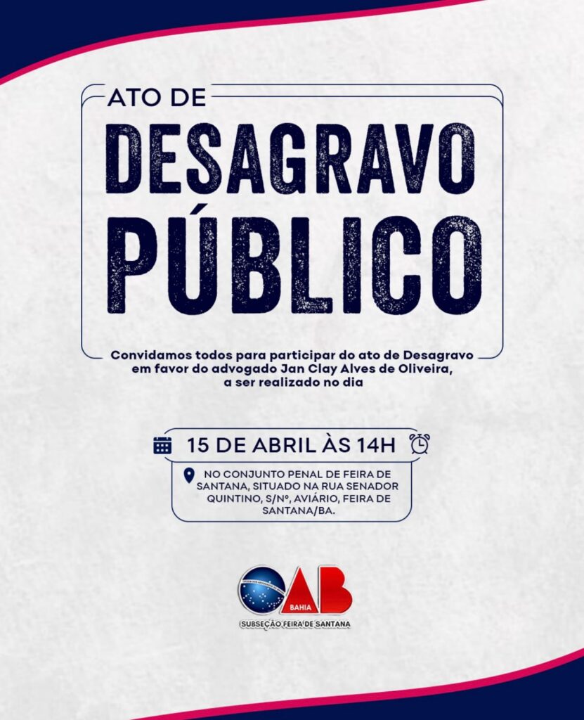 O desagravo público aconteceu porque o advogado criminalista Jan Clay Alves de Oliveira sofreu, em 4 de dezembro de 2024, agressões por parte do diretor do Presídio Regional de Feira de Santana, à época, José Freitas Júnior. Mais especificamente, num momento em que o advogado utilizava seu celular em uma área permitida dentro do Conjunto Penal, ouviu o diretor lhe dizer: “Se respeita no seu lugar” e, depois, ainda deu um tapa no telefone do advogado.