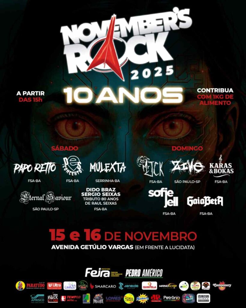 Nos dias 15 e 16 de novembro, a partir das 15h, acontece a 10ª edição do festival beneficente Novembers Rock, em Feira de Santana. No evento, o público poderá desfrutar de uma variedade de bandas de rock se apresentando no antigo espaço Marcus Morais, na Avenida Getúlio Vargas.