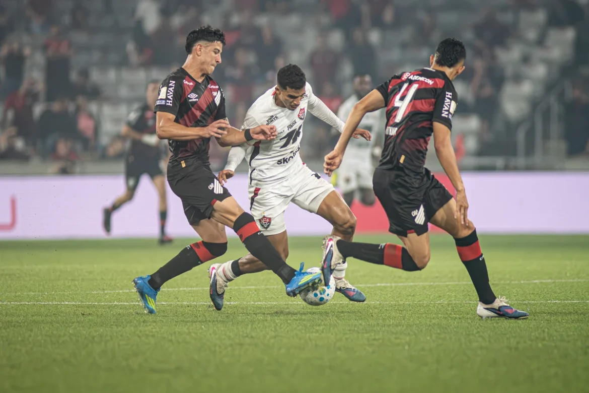 O Vitória mostrou vontade até quando não podia. Logo no início do jogo, o juiz precisou voltar a saída de bola, pois os atletas do Leão invadiram o campo adversário antes mesmo do primeiro toque na bola. Lampejos de empolgação de um time que, a cada rodada, parece aprender a jogar fora de casa. Nem afobação, tampouco medo. Jogando contra Athletico-PR, o Leão decidiu cozinhar o confronto. Não estava melhor, mas conseguia segurar o jogo, aguardando uma oportunidade de ouro. Isso fez o duelo esfriar e não ter nada de bom até os 17 minutos, com uma cabeçada de Zé Vitor.