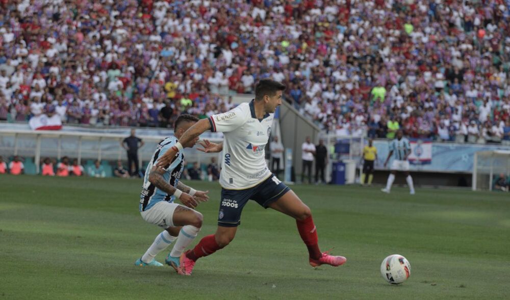 Nos pouco mais de 50 minutos que antecederam esse lance, Bahia e Grêmio protagonizaram uma partida equilibrada e ‘brigada’, com poucos riscos e falta de qualidade na construção das jogadas e nas finalizações. O Esquadrão tinha um pouco mais de posse de bola, mas esbarrava na bem postada defesa gremista e no mau desempenho de seus atacantes.