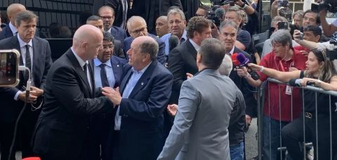 Infantino chegou acompanhado do presidente da CBF, Ednaldo Rodrigues, e do presidente da Conmebol, Alejandro Dominguez.