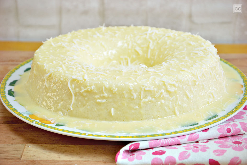 - Retire, desenforme sobre um prato, regue com o leite condensado restante, polvilhe com o coco ralado restante e sirva em seguida.